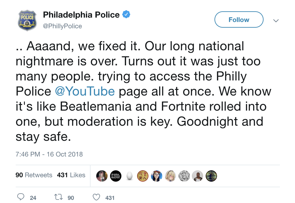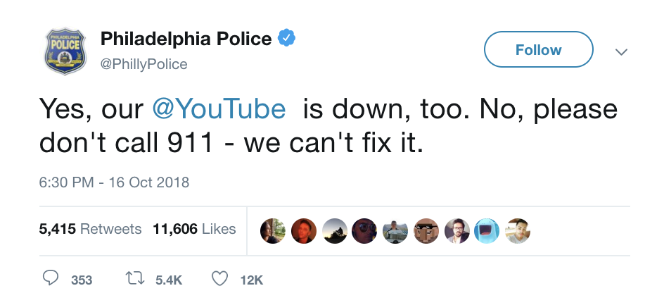 Được biết, người dân tại khu vực này đã gọi cảnh sát liên tục để thông báo về việc YouTube bị mất sóng và không thể truy cập được. Theo lẽ thường tình, hẳn ai cũng biết rằng lĩnh vực này không thuộc phạm trù xử lý của cảnh sát. Tuy nhiên, có lẽ đây là cách trút bực dọc của người dân Philadelphia trong vài tiếng YouTube “mất màu”.