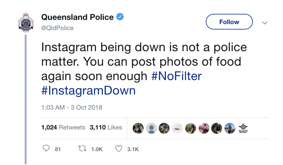Trước đó vài hôm, khi mạng xã hội Instagram bị sập trong tầm 45 phút. Người dân tại bang Queensland, Úc cũng không quên nhắn hộ cảnh sát nhờ sửa chữa. Đến nỗi cảnh sát tại nơi đây phải lên Twitter nhắc nhở rằng đây không phải là vấn đề mà cảnh sát có thể giải quyết.