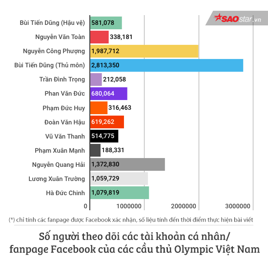 Thủ môn Bùi Tiến Dũng đang là người sở hữu trang cá nhân được theo dõi nhiều nhất với con số lên tới trên dưới 2,8 triệu lượt người theo dõi. Công Phượng, Quang Hải, Hà Đức Chinh, Lương Xuân Trường cũng là một số cầu thủ đang nhận được trên 1 triệu lượt theo dõi. Cá biệt có trường hợp của Công Phượng, chàng cầu thủ này có lẽ chỉ cần thêm một thời gian ngắn nữa để fanpage chính thức của mình đạt được 2 triệu lượt theo dõi. Các tài khoản hay fanpage được nhắc đến trong bài viết này chỉ tính đến các tài khoản/ fanpage đã được gắn dấu xanh (verified).