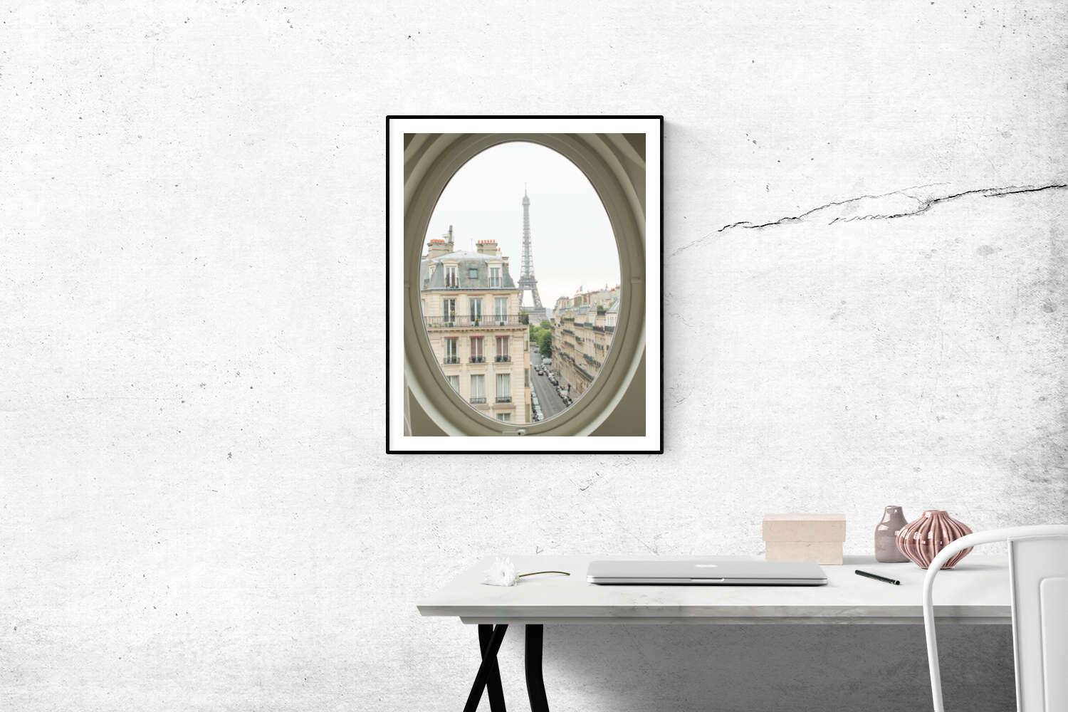 Khung hình với cảnh phía sau cửa sổ là tháp Eiffel nổi tiếng cùng dãy nhà cao tần nối san sát nhau mang lại cảm giác cực kỳ chân thực và đẹp mắt. Phần khung tranh dạng thẳng đứng với kích thước 16×20 và được giao hàng quốc tế.