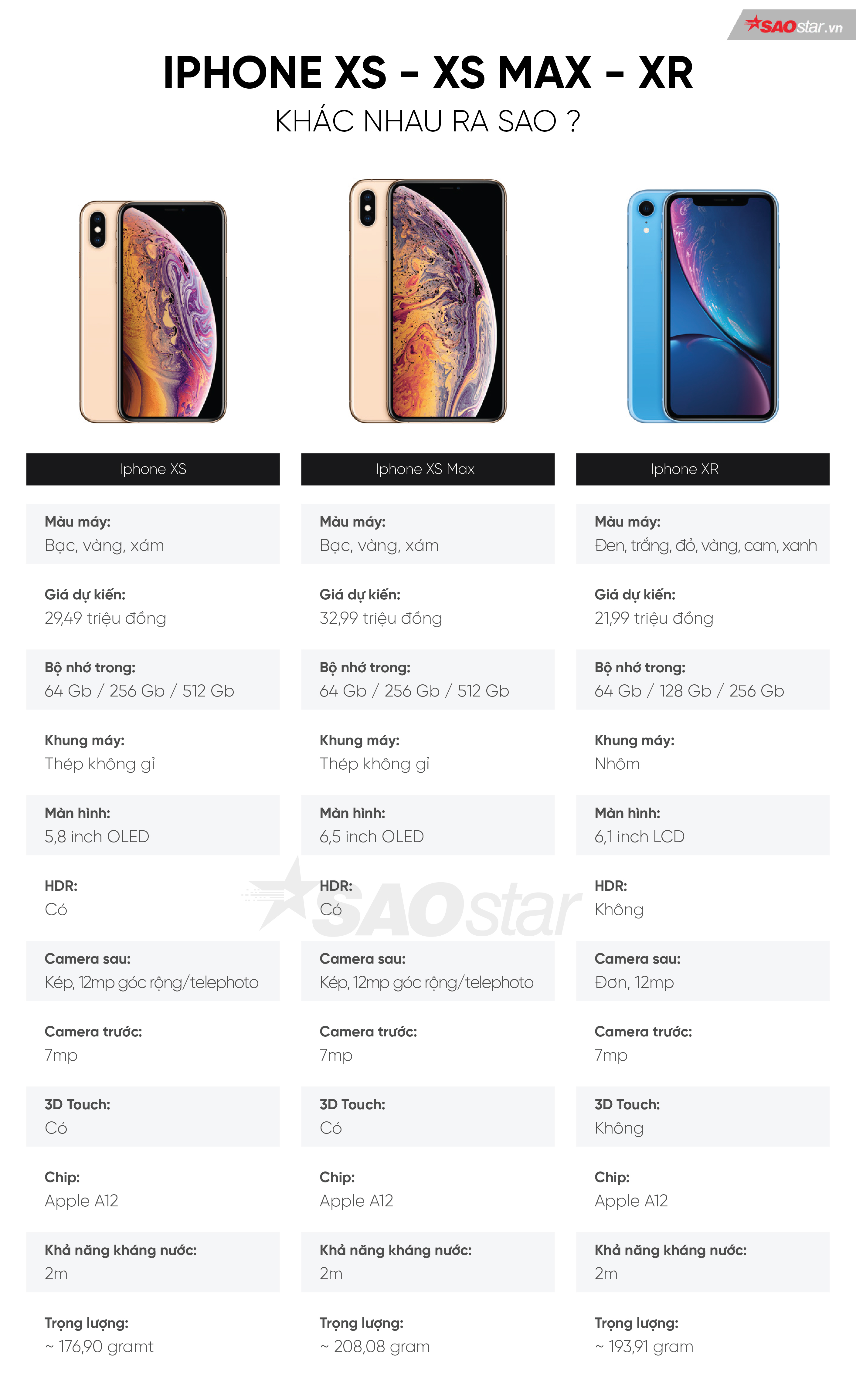 Sau rất nhiều chờ đợi và đồn đoán, iPhone Xs, iPhone Xs Max và iPhone Xr cũng đã chính thức được Apple trình làng trong sự kiện diễn ra vào 0h sáng ngày 13 tháng 9 (theo giờ Việt Nam). Nếu cảm thấy quá “rối rắm” với tất cả những thông tin Apple công bố đêm qua về chiếc iPhone mới, hình ảnh tổng hợp dưới đây sẽ giúp bạn có được cái nhìn tổng quan một cách nhanh nhất.