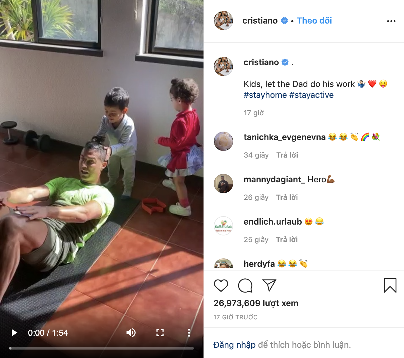 Chỉ với đoạn video vừa tập luyện vừa chơi đùa cùng các con, Ronaldo đã “đút túi” 26 lượt xem chỉ trong chưa đầy 1 ngày đăng tải.