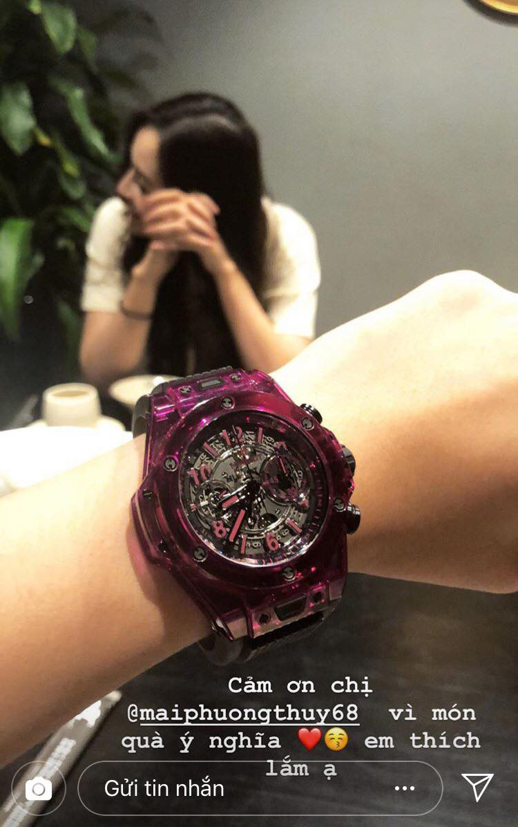 Đỗ Mỹ Linh khoe chiếc đồng hồ sang chỉnh được đàn chị gửi tặng.