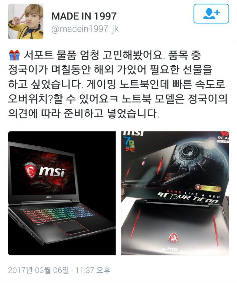 Jungkook thậm chí từng được một người hâm mộ ngỏ ý tặng chiếc laptop chơi game thương hiệu MSI khiến nhiều người cảm thấy bất ngờ. Bên cạnh một số dòng máy tính phổ thông, những chiếc laptop chuyên dụng cho game thủ của MSI có thể có giá lên tới trên dưới 100 triệu đồng.