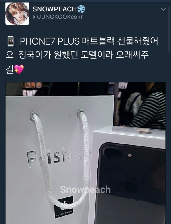 Jungkook cũng từng được người hâm mộ tặng iPhone 8 Plus. Fan hâm mộ này gửi gắm “đây là mẫu điện thoại mà Jungkook muốn” và người này mong cậu chàng sẽ “dùng nó dài dài.”