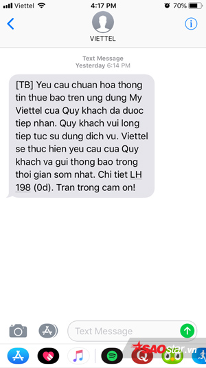 Cùng gặp phải vấn đề như trên nhưng Tuấn Anh, một chủ thuê bao Viettel tại Hà Nội chia sẻ buổi chiều hôm qua, sau 2 tuần cập nhật thông tin trên My Viettel, anh đã nhận được tin nhắn của nhà mạng đề cập đến việc thông tin cập nhật đã được tiếp nhận, nhà mạng sẽ thực hiện yêu cầu trong thời gian sớm nhất trong khi thuê bao có thể tiếp tục sử dụng dịch vụ.