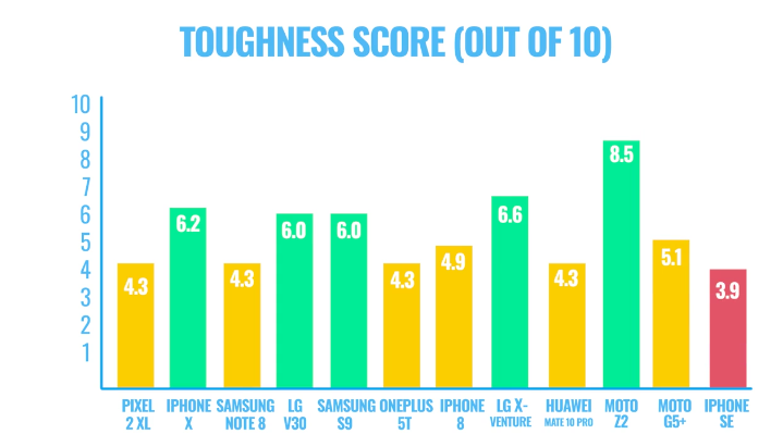 Điện thoại “bé hạt tiêu” của Apple iPhone SE là smartphone có thành tích độ bền kém nhất trong thử nghiệm của Tom’s Guide khi nứt màn hình mạnh ngay từ cú thả rơi xuống bê tông úp mặt từ độ cao 1,2 mét. Đến độ cao 1,8 mét, màn hình nứt mạnh đến mức Tom’s Guide quyết định cho chiếc máy dừng cuộc chơi vì màn hình “quá nguy hiểm để sử dụng”. (Điểm: 3,9/10)