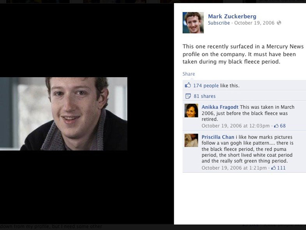Có lẽ một trong những “dấu hiệu” nhận biết đầu tiên về mối quan hệ dài lâu và bền chặt giữa Mark Zuckerberg và Chan là việc cô biết anh từ trước khi Mark chỉ gắn liền với áo hoodies. “Có giai đoạn của áo khoác lông cừu màu đen, áo puma đỏ, áo khoác trắng và rồi là cả giai đoạn đồ màu xanh nhạt,” Chan bình luận trên một bài đăng của Mark trên Facebook.