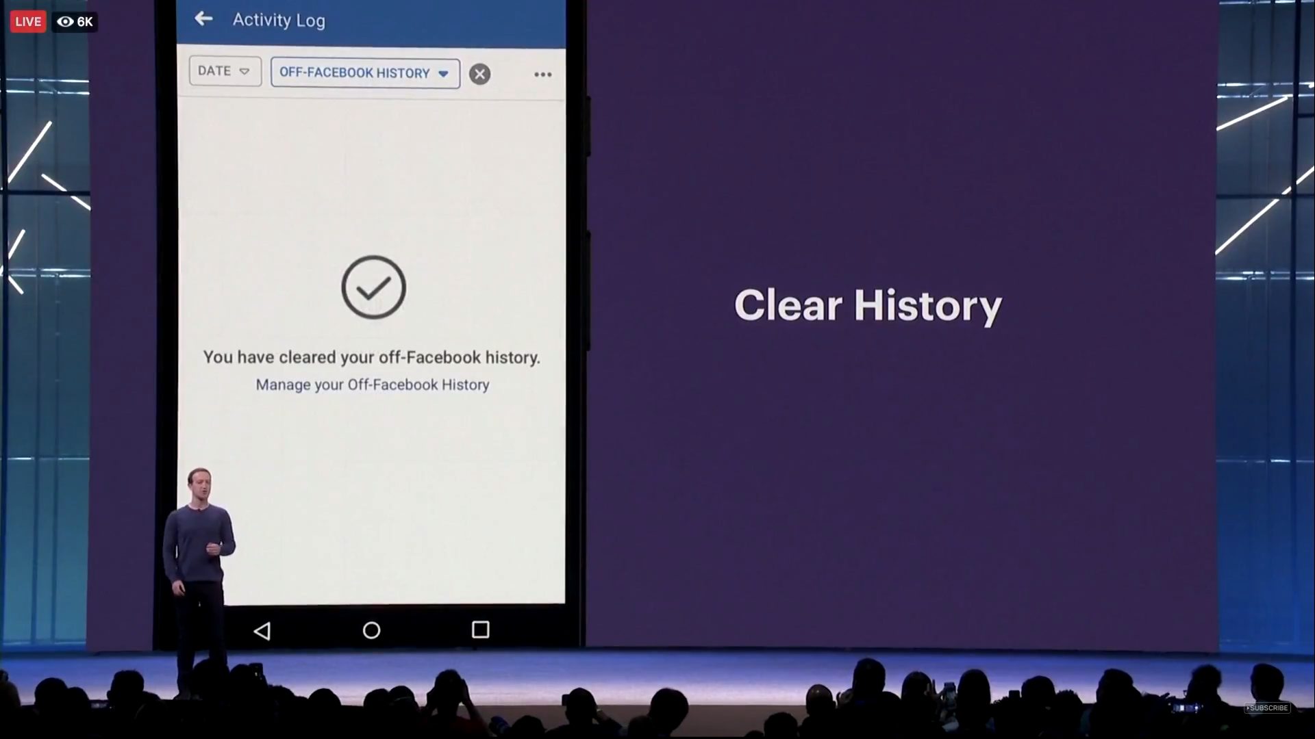 Trong khuôn khổ hội nghị F8 diễn ra vào tháng 5/2018, CEO Facebook - Mark Zuckerberg đã tiết lộ hãng đang phát triển một công cụ mới, cho phép người dùng có thể kiểm soát quyền riêng tư bằng cách xóa lịch sử duyệt web. Theo Facebook, công cụ xóa này sẽ rất khác với việc xóa lịch sử duyệt web hay xóa cookies của trình duyệt.