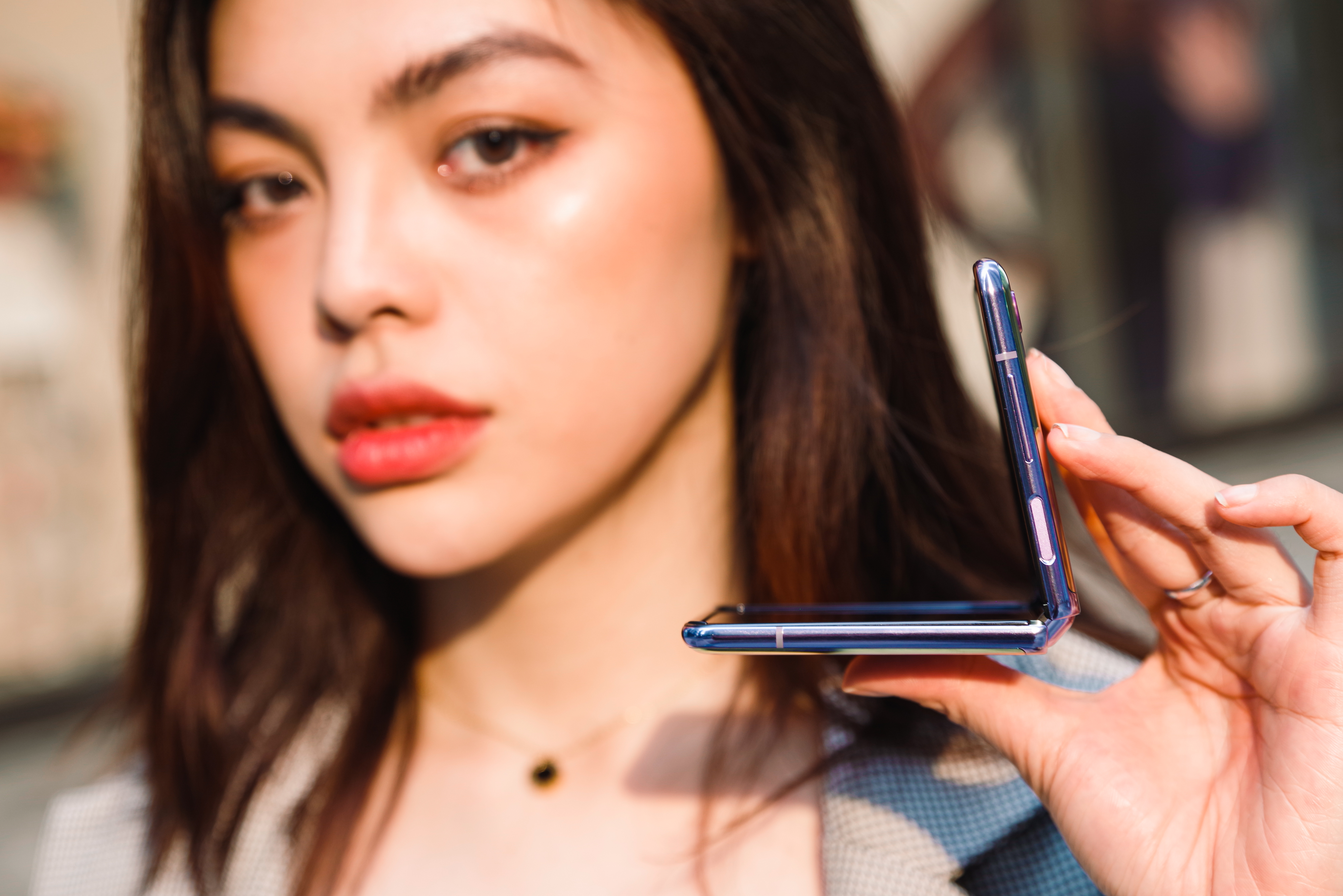 Cách thức trên tay, tương tác cùng Galaxy Z Flip cũng mang đầy cảm hứng thời trang và tinh thần sành điệu. Ở góc mở 900, trông thiết bị không khác gì một hộp phấn hay cushion sang trọng, biến người dùng thành tâm điểm thu hút mọi ánh nhìn.