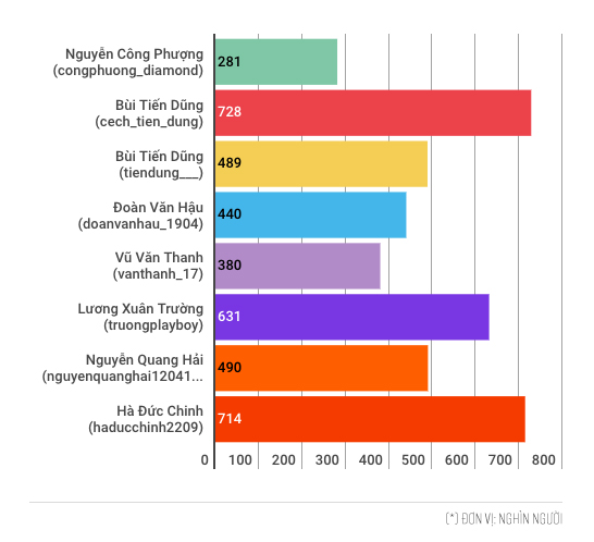 Sau thành công của đội tuyển U23 Việt Nam tại giải vô địch U23 Châu Á hồi đầu năm nay và sau đó là sức hút đến từ ASIAD 2018 của đội tuyển Olympic Việt Nam, sức hút của các cầu thủ Việt Nam trên mạng xã hội cũng tăng lên nhanh chóng. Trong đó, thủ môn Bùi Tiến Dũng được xem là cầu thủ có lương người theo dõi trên Instagram lớn nhất ở thời điểm hiện tại. Cụ thể, chàng thủ môn tài năng và điển tra này hiện đang có 728 nghìn người theo dõi. “Hot” không kém là Hà Đức Chinh với 714 nghìn người theo dõi. Mặc dù là một gương mặt khá hút truyền thông nhưng Công Phượng lại không quá nổi bật trên Instagram so với đồng đội. Anh hiện có 281 nghìn người theo dõi trên mạng xã hội này.