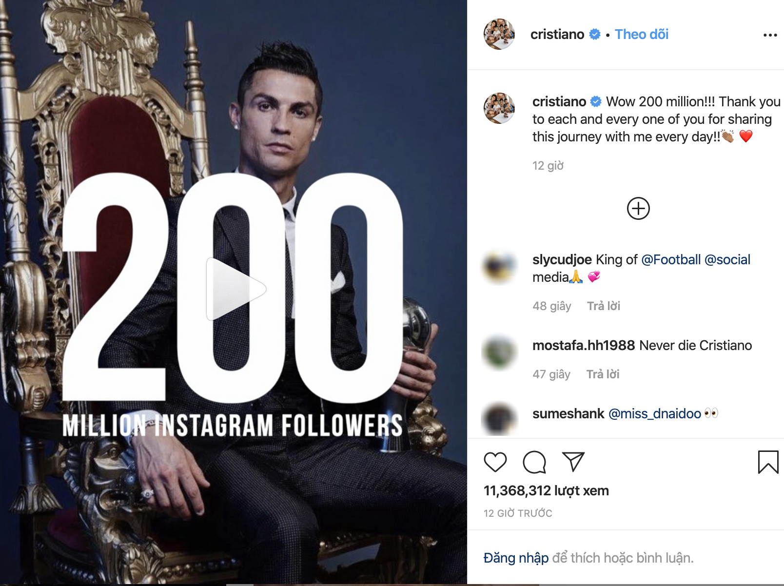 Được biết, thời điểm tháng 5/2017, ngôi sao bóng đá người Bồ Đào Nha đã trở thành cầu thủ đầu tiên đầu tiên cán mốc 100 triệu người theo dõi trên Instagram. Chỉ chưa đầy 3 năm, Ronaldo đã tiếp tục lập thêm thành tích đạt 200 triệu người.