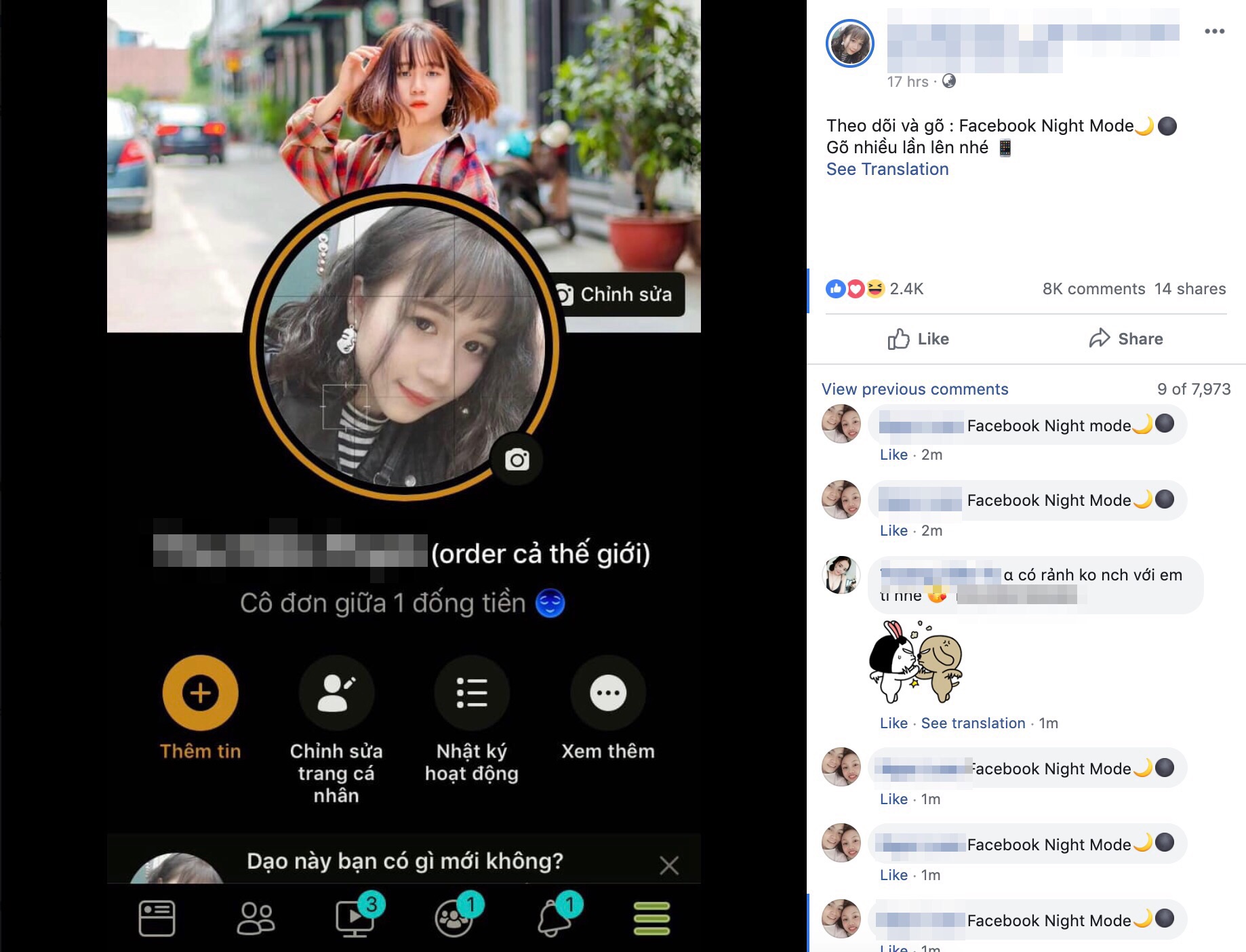 Khi trào lưu comment “bisou” còn chưa hết hot, một trào lưu khác kêu gọi comment “Facebook night mode” để chuyển giao diện Facebook sang màu đen đã bắt đầu nổi lên như một hiện tượng. Mỗi ngày có hàng chục nghìn bình luận được đăng tải vào những bài đăng kêu gọi kể trên. Và theo lẽ tất nhiên, những bài đăng kêu gọi này cũng chỉ là thông tin giả mạo nhằm dụ người dùng like, commnet, share để câu tương tác.