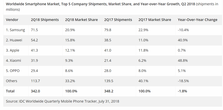 Theo báo cáo mới nhất của IDC, trong quý II năm nay, Samsung là nhà sản xuất dẫn đầu thị trường smartphone toàn cầu với 71,5 triệu máy điện thoại bán ra cùng miếng bánh thị phần lên tới 20,9%. Dù vậy, những gì Samsung đạt được lại thể hiện mức giảm 10,4% so với cùng kì năm trước. Trái ngược, Huawei là nhà sản xuất có cú bứt tốc mạnh mẽ với mức tăng 40,9% so với cùng kì năm trước cùng con số tuyệt đối 54,2 triệu máy bán ra trong quý II, chiếm 15,8% thị phần. Apple trong khi đó tăng trưởng nhẹ ở mức 0,7% cùng doanh số 41,3 triệu máy và thị phần 12,1%. Xiaomi và OPPO là hai hãng còn lại góp mặt trong top 5 với mức thị phần 9,3% và 8,6%.