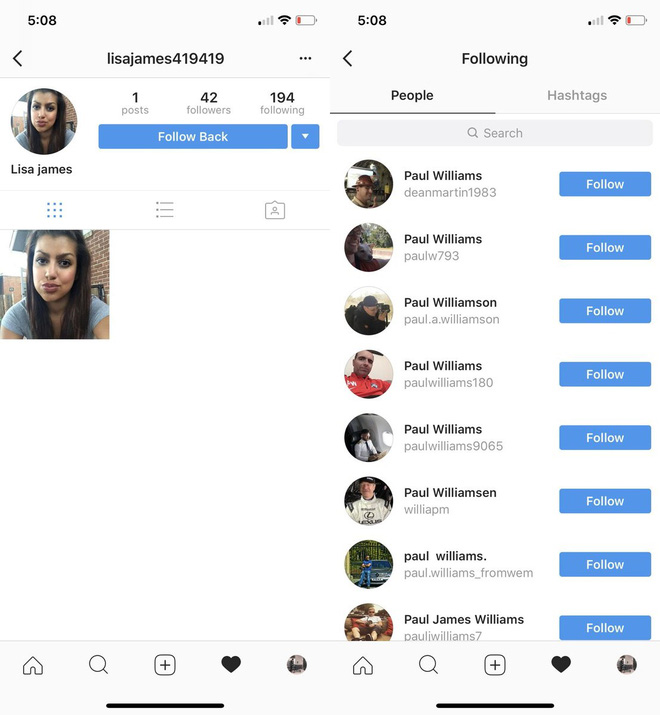 Mới đây, anh chàng Paul William, 19 tuổi cảm thấy hiếu kì vì được tài khoản có tên lisajames419419 follow trên Instagram. Tuy nhiên, khi biết đây chỉ là một tài khoản ảo nên anh chàng cũng chẳng mấy bận lòng.