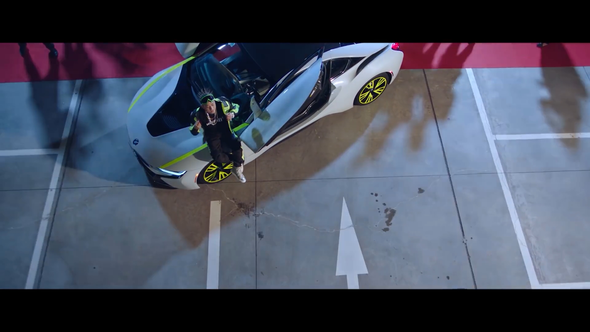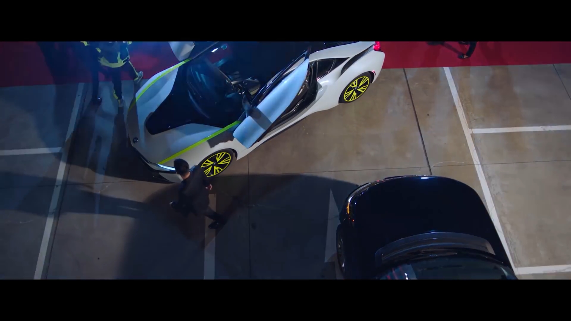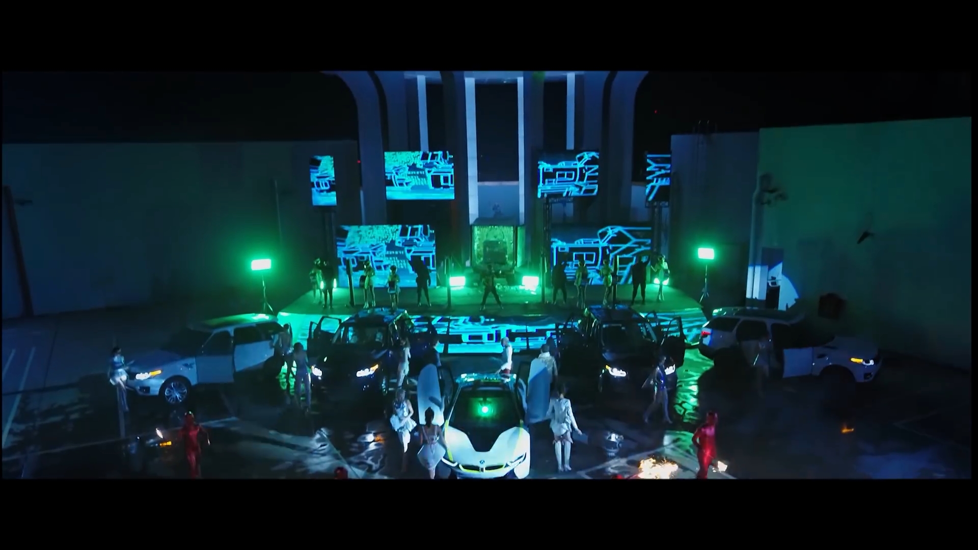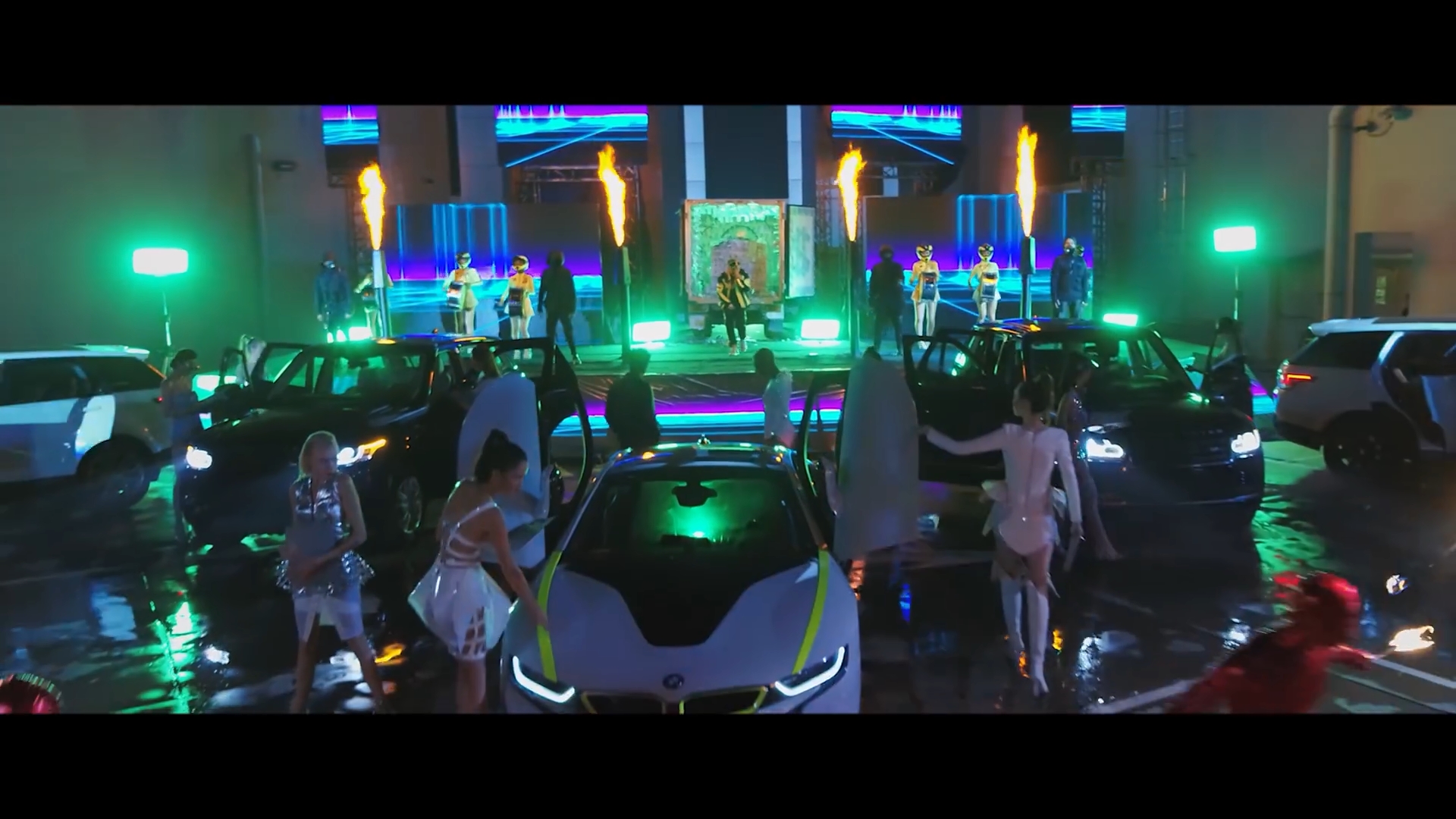 BMW i8 trắng nổi bật với bộ mâm và những họa tiết đồng màu xanh phản quang trong MV.