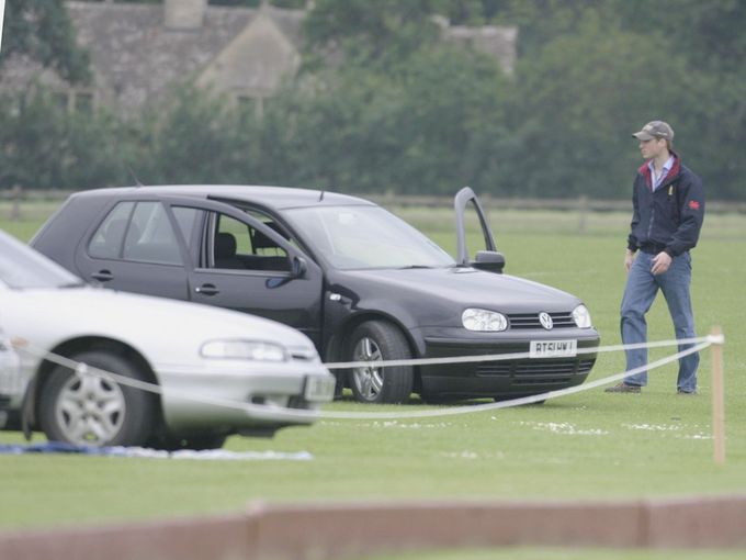 Hoàng tử William di chuyển về phía chiếc xe của mình sau khi xem một trận polo tại sân Beufort vào ngày 7 tháng 6 năm 2003.