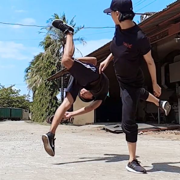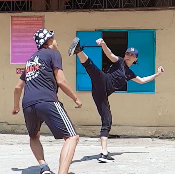 Một pha hành động đẹp mắt của Vân trên phim trường Hai Phượng. (ảnh chụp từ clip).
