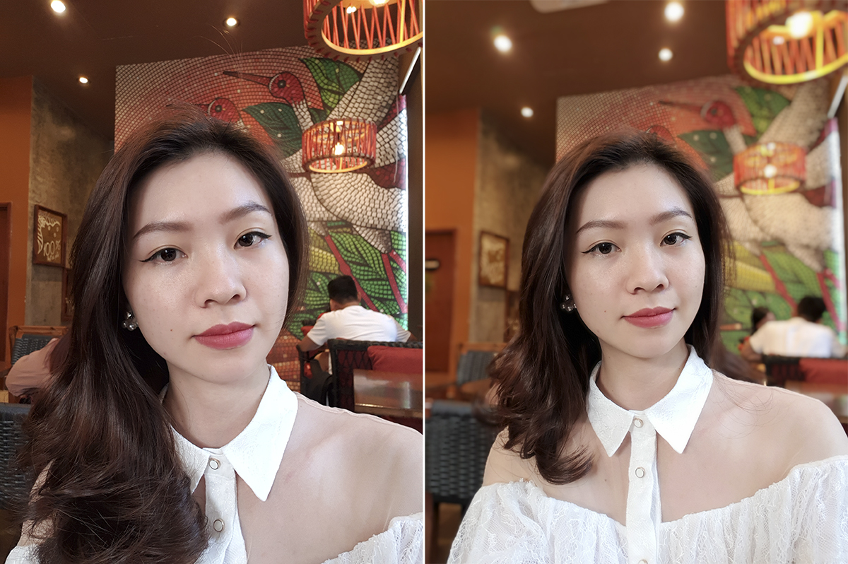 Selfie ở điều kiện ánh sáng trong nhà. Ảnh bên phải có bật chế độ xoá phông.