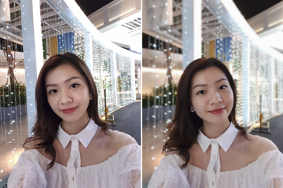Selfie ở điều kiện thiếu sáng. Ảnh bên phải có bật chế độ xoá phông.