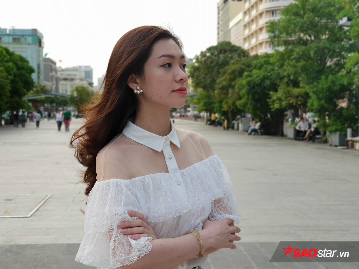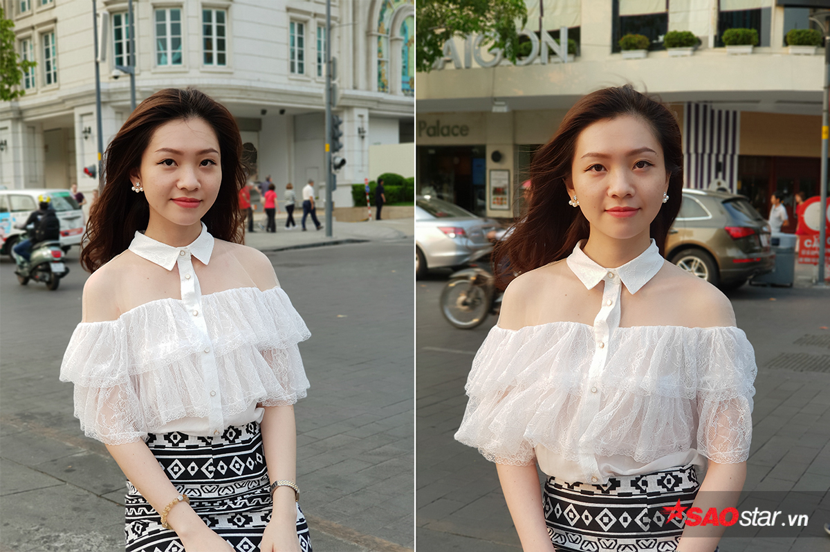 Selfie ở điều kiện ánh sáng ngoài trời. Ảnh bên phải có bật chế độ xoá phông.