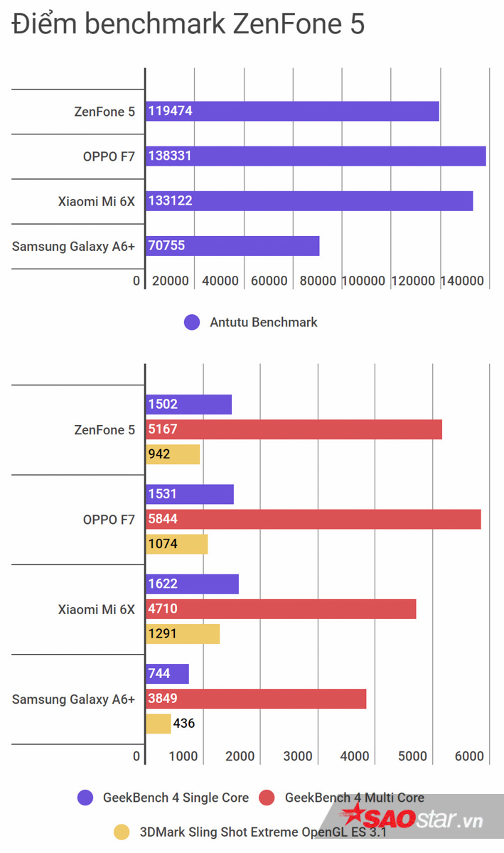 Khi cuộc đua cấu hình đã bắt đầu nguội lạnh nên việc ZenFone 5 được trang bị vi xử lý Snapdragon 636, 4 GB RAM, 64 GB bộ nhớ trong và hỗ trợ thẻ nhớ ngoài (bạn phải chọn dùng 1 SIM + thẻ nhớ hoặc chỉ 2 SIM) là đủ đầy cho một sản phẩm mức giá 8 triệu. Không phải mạnh nhất nhưng nó cũng không thua quá nhiều khi so với OPPO F7 hay Xiaomi Mi 6X , tất nhiên là vượt trội khi so sánh với hai mẫu Galaxy A6/A6+ mới ra mắt của Samsung.