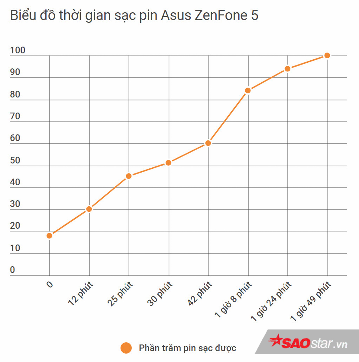 Asus cho biết có trang bị tính năng AI Charging giúp quản lý dòng điện sạc giúp tối ưu thời gian cũng như đảm bảo tuổi thọ viên pin. Hãng công bố máy có thể sạc được 60% pin chỉ trong vòng 38 phút. Thử nghiệm thực tế và kết quả cho thấy với củ sạc đi kèm loại 5V - 2A (đây là loại thông dụng hiện nay, không hỗ trợ sạc nhanh), mất 42 phút để sạc từ 18% tới 60%. Có thể cần tới một củ sạc hỗ trợ Quick Charge 3.0 thì mới có thể đạt được con số mà Asus công bố.