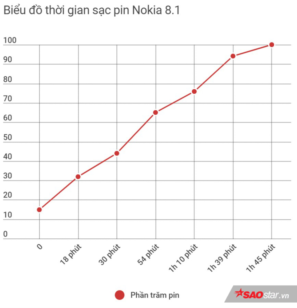 Dùng vi xử lý cận cao cấp của Qualcomm nên dễ hiểu Nokia 8.1 hỗ trợ chuẩn sạc nhanh Quick Charge 3.0 và có củ sạc 18W đi kèm. Không siêu nhanh như VOOC của OPPO F9 nhưng thời gian sạc trên Nokia 8.1 là đủ làm hài lòng số đông, cũng như sự tương thích giữa dây cáp và củ sạc đa dạng hơn rất nhiều so với giải pháp độc quyền từ OPPO.