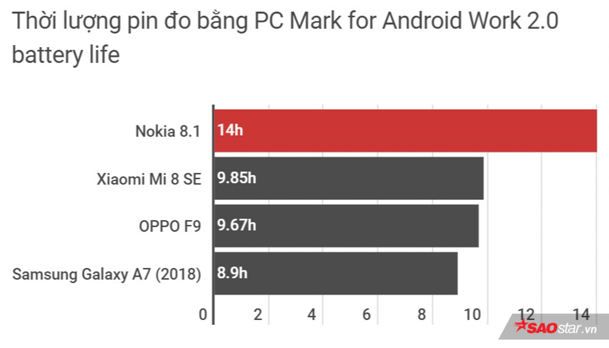 Viên pin dung lượng 3.500 mAh cung cấp thời gian sử dụng thoải mái cho sản phẩm chủ lực mới ở phân khúc tầm trung của HMD tại nước ta. Nhiều smartphone khác cùng giá tiền cũng có thời lượng sử dụng ở mức tốt tuy nhiên với Nokia 8.1 nó bắt đầu chạm tới ngưỡng xuất sắc. Dùng tới 1,5 ngày nếu “bào pin” với 2 SIM, 4G, wifi, bluetooth, GPS bật liên tục, chơi game thời gian rảnh và nhận hàng trăm tin nhắn Messenger, khoảng 20 email một ngày. Bạn hoàn toàn có thể kỳ vọng 2 ngày, thậm chí 3 ngày nếu dùng máy một cách từ tốn hơn.
