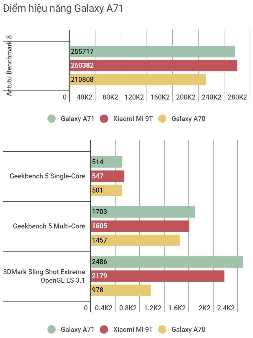 So về mặt hiệu năng tổng thể, sức mạnh đại diện nhà Samsung tương đồng với các sản phẩm khác như Xiaomi Mi 9T, OPPO Reno2 có cùng vi xử lý. Tất nhiên bạn sẽ thấy đây là bước dài so với người tiền nhiệm Galaxy A70 năm ngoái vốn chỉ dùng vi xử lý Snapdragon 675.