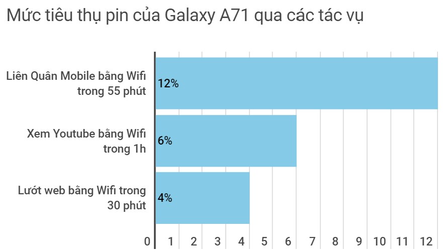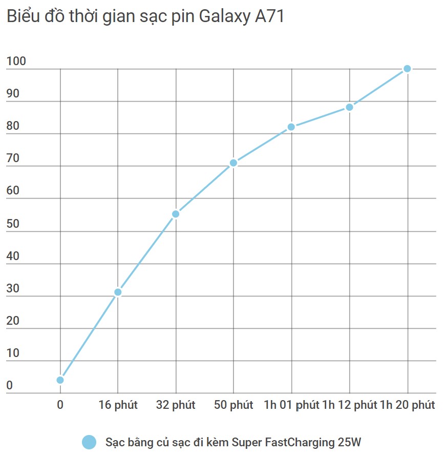 Kết quả này tương tự đàn anh Galaxy A70 trước đó làm được và vẫn đang tỏ ra “không đối thủ” trong phân khúc giá 10 triệu đồng hiện nay. Chưa hết, Samsung còn ưu ái cho Galaxy A71 công nghệ sạc nhanh Super FastCharging 25W vốn xuất hiện trên dòng cao cấp như Galaxy Note10|S20. Sử dụng thực tế cho thấy dù viên pin dung lượng lớn nhưng máy chỉ mất vọn vẹn 1h20 phút để nạp đầy năng lượng, nhanh hơn cả những đối thủ có viên pin nhỏ hơn.