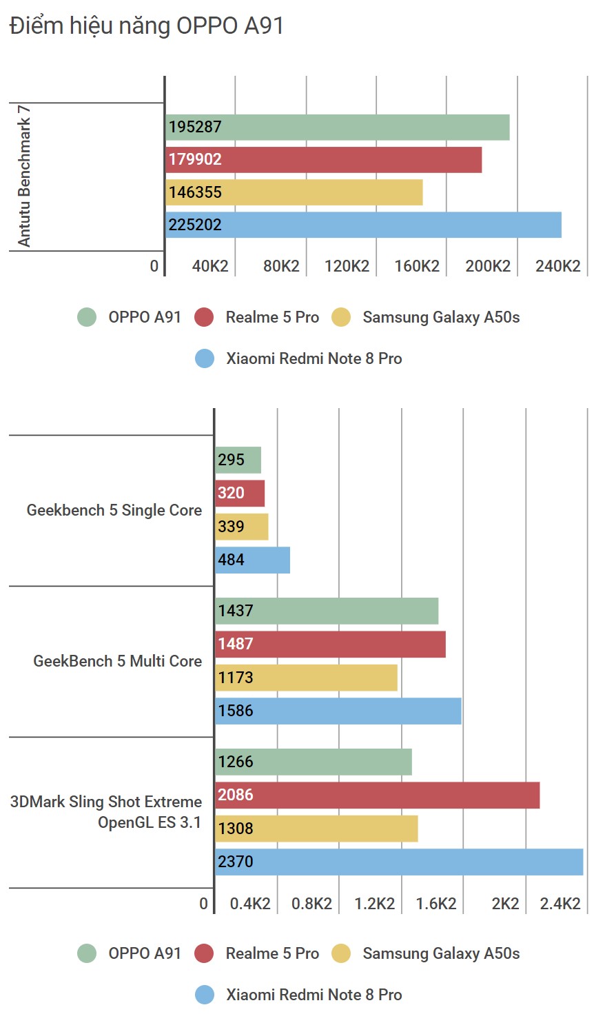 Cấu hình không phải là thế mạnh của OPPO A91 trước một số đối thủ khác cùng phân khúc, tuy vậy điều đó không đồng nghĩa mẫu “cạ cứng” này thuộc hàng yếu ớt. Ngược lại, vi xử lý Helio P70, RAM 8 GB và 128 GB bộ nhớ trong đem lại độ mượt mà cần thiết trong mọi tác vụ sử dụng hằng ngày như chuyển đổi giữa các ứng dụng không bị giật lag, sử dụng nhiều ngày liên tục không hề có hiện tượng chậm đi.