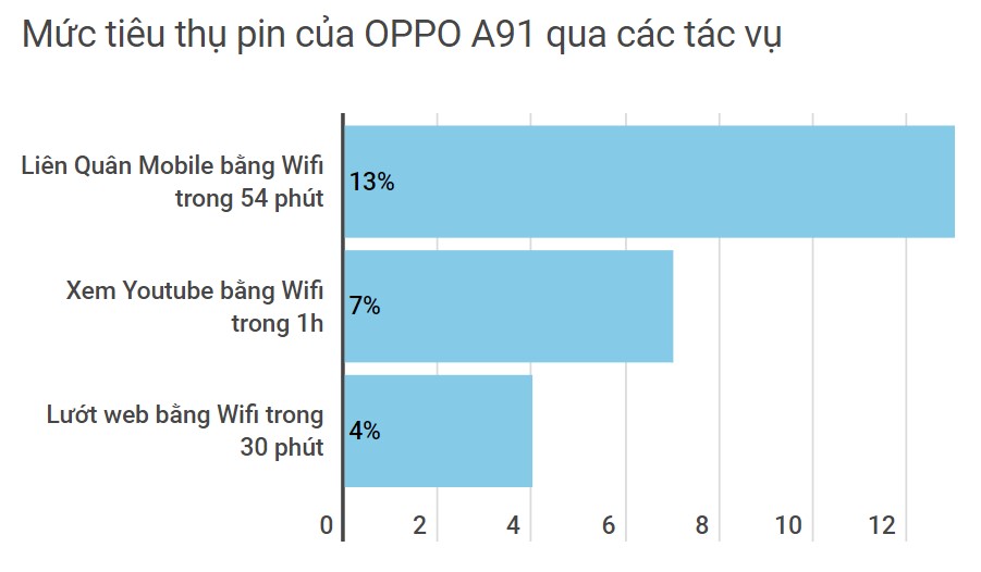 Bên cạnh màn hình và camera, thời lượng sử dụng pin là điểm mạnh khác đáng quan tâm của OPPO A91. Không chỉ sở hữu viên pin dung lượng “chuẩn chỉnh” 4.230 mAh mà đây còn là đại diện A-Series đầu tiên được hãng trang bị công nghệ sạc nhanh VOOC 3.0, tương tự Reno-Series cao cấp hơn. Chính nhờ vậy bạn có thể tự tin dùng máy nguyên ngày với các tác vụ “đốt pin” nhiều như chơi game, chụp ảnh, đồng thời không phải chờ quá lâu khi đã có công nghệ sạc nhanh trứ danh.