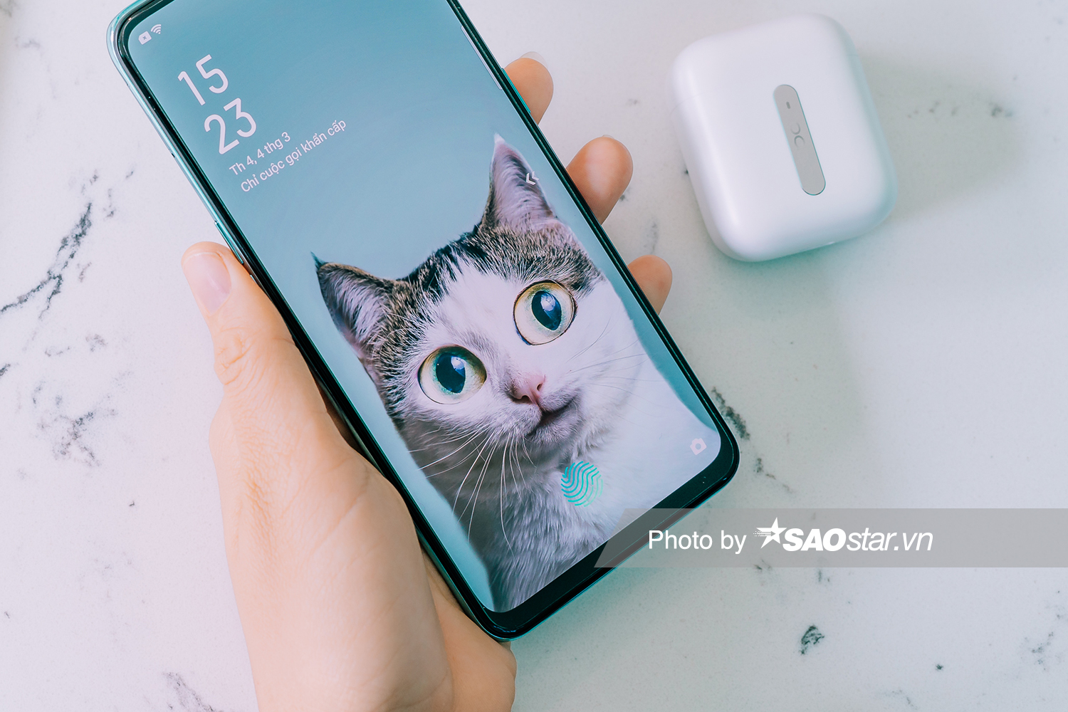 Một điểm nổi trội khác nằm bên dưới màn hình của OPPO A91 là cảm biến vân tay thế hệ thứ 3. OPPO cho biết cảm biến mới giúp máy chỉ mất 0,32s để nhận diện và mở khóa thành công, nhanh hơn nhiều so với thế hệ cũ. Thực tế sử dụng cho thấy máy nhận diện vân tay rất nhanh, thậm chí trường hợp tay ẩm ướt vẫn hoạt động trơn tru, không hề có hiện tượng thử đi thử lại nhiều lần phiền toái như trước đây.