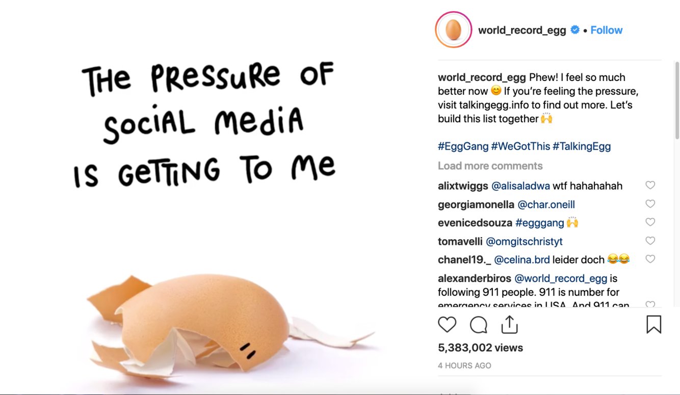 Sau khi đạt được mục tiêu đó, tài khoản @world_record_egg đã tiếp tục đăng tải hình ảnh với quả trứng cùng vết nứt lớn dần sau mỗi bài đăng. Cuối cùng, vào hôm Chủ nhật tuần qua, một đoạn video đã được đăng tải trong sự kiện Super Bowl cho thấy quả trứng đã bị vỡ trước áp lực của sự nổi tiếng - truyền đi một thông điệp liên quan đến sức khoẻ tinh thần.