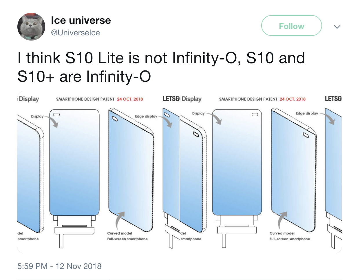 Theo nguồn tin từ leaker Ice Universe, người luôn tuồn thông tin chính xác về những chiếc smartphone thương hiệu Samsung trước khi ra mắt, hai phiên bản Galaxy S10 và Galaxy S10+ sẽ được trang bị màn hình Infinity-O. Tuy nhiên, phiên bản còn lại có thể chỉ sử dụng màn hình tương tự thế hệ tiền nhiệm.