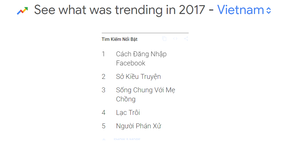 Nội dung tìm kiếm nổi bật nhất trên Google trong năm 2017 của người Việt là “Cách đăng nhập Facebook”. Nhiều người tỏ ra khá bất ngờ khi từ khóa này lọt top đầu xu hướng tìm kiếm. Người dùng Internet Việt Nam cũng rất quan tâm đến giải trí khi 4/5 từ khóa hot nhất đều liên quan đến lĩnh vực này.