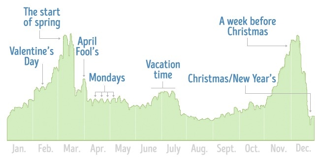 Hầu hết các cặp đôi trên Facebook rạn nứt vào tháng Hai, giữa tháng Năm và tháng Bảy.Theo Facebook nguyên nhân của những mối tình tan vỡ này có thể liên quan đến ngày lễ tình yêu, giống như phim “Blue Valentine” chẳng hạn. Ngoài ra thì khoảng thời gian năm mới và nghỉ hè cũng là lúc các cặp đôi hay “chia rẽ làm 2 chiến tuyến” vì những thứ liên quan đến việc chi tiêu.