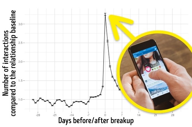 Khoảng một tuần trước khi mối quan hệ tan vỡ, những kẻ đau khổ vì tình thường trò chuyện nhiều hơn với bạn bè và người thân. Trong ngày chia tay, lượng tương tác của họ và những người dùng khác tăng đột biến lên 225%, đây có thể là kết quả từ những tin nhắn động viên, an ủi của bạn bè và người thân.