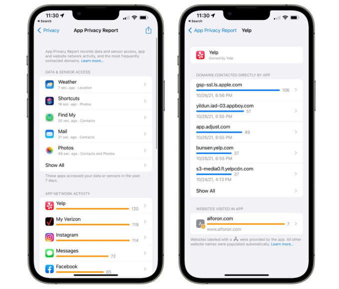 App Privacy Report là một trong những tính năng của iOS 15 được Apple giới thiệu tại WWDC nhưng mới xuất hiện chính thức trên bản 15.2. Mục này cho phép người dùng theo dõi tần suất các ứng dụng truy cập vào thông tin bị hạn chế quyền như vị trí, ảnh, camera, microphone và danh bạ trong vòng 7 ngày. Người dùng Vào Cài đặt/Bảo mật/Báo cáo quyền riêng tư của ứng dụng để xem tính năng mới này.