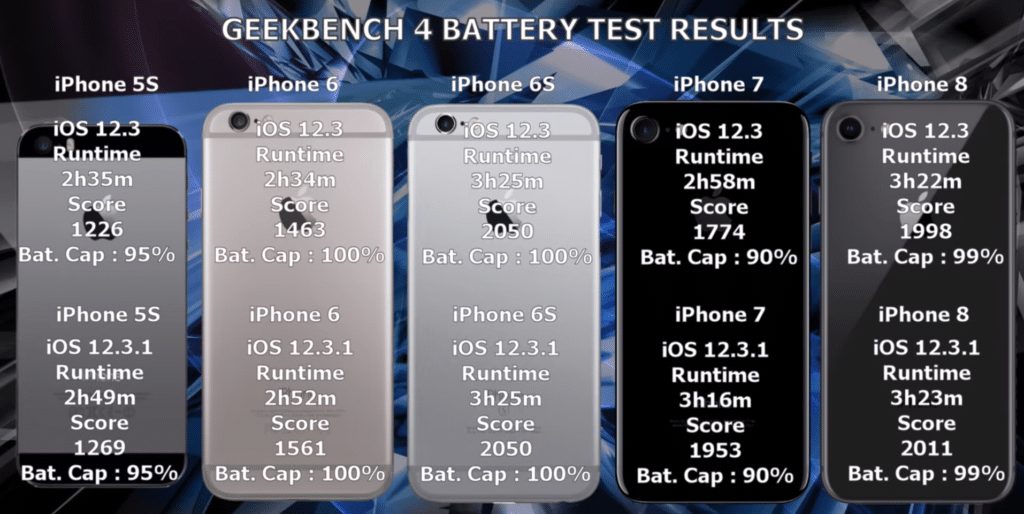 Khi sử dụng iOS 12.3, iPhone 5s, iPhone 6 và iPhone 7 có thời lượng pin lần lượt là 2 giờ 35 phút, 2 giờ 34 phút và 2 giờ 58 phút trong bài thử nghiệm của Geekbench. Sau khi thực hiện nâng cấp, iPhone 5s kéo dài thêm 14 phút lên mức 2 giờ 49 phút. iPhone 6 và iPhone 8 có thời lượng pin tăng thêm 18 phút.