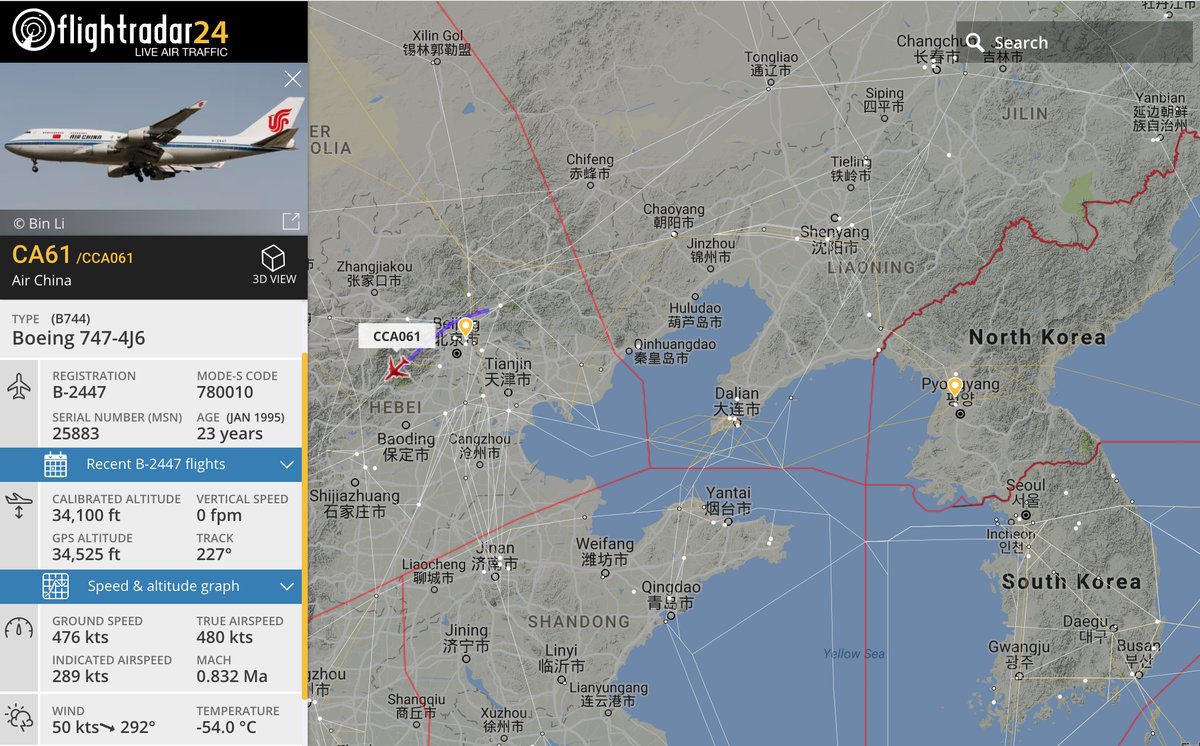Thông tin về chuyến bay được cho là chở theo ông Kim Jong-un tới Singapore, theo ghi nhận của Flightradar24.