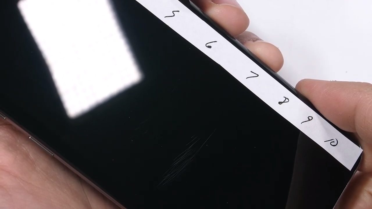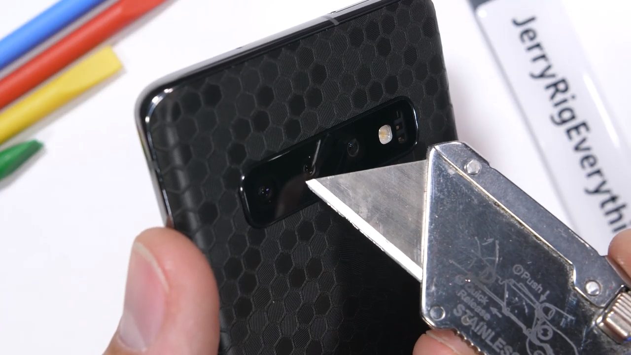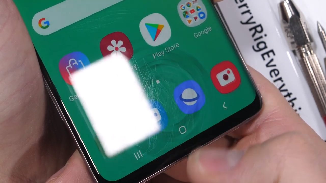 Trong bài thử nghiệm cào xước đầu tiên, Samsung Galaxy S10 bắt đầu xuất hiện vết xước từ mức 6 trong thang đo độ cứng Mohs. Kể từ mức 7, các vết xước bắt đầu xuất hiện dày đặc hơn.