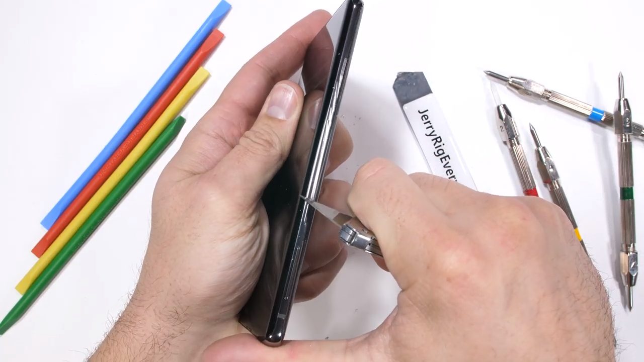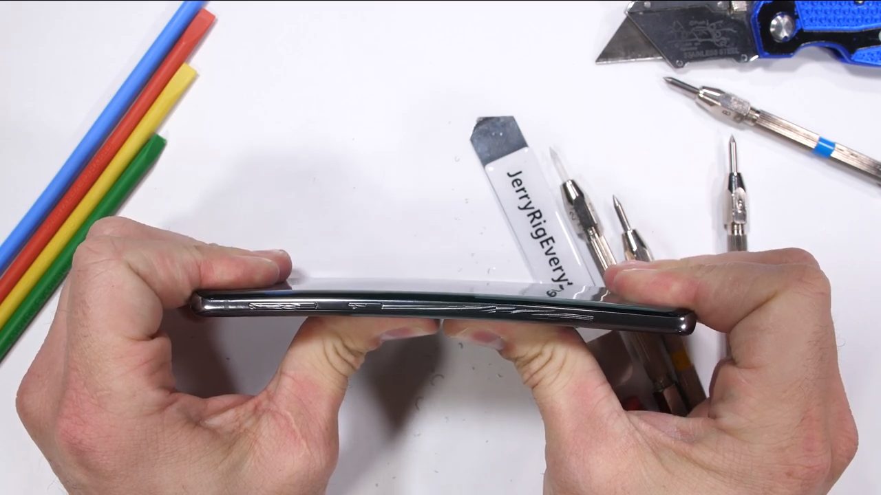 Tương tự như các lần trước, các bài kiểm tra độ bền của JerryRigEverything, gồm: dùng kim, dao rọc giấy để cào xước, đốt màn hình và bẻ cong điện thoại.