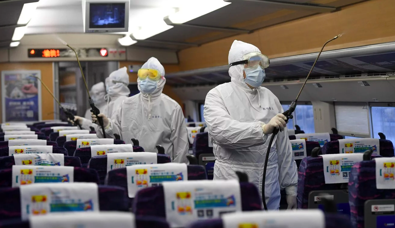 Nhân viên đường sắt khử trùng một toa tàu ở Trung Quốc. (Ảnh: Xinhua)