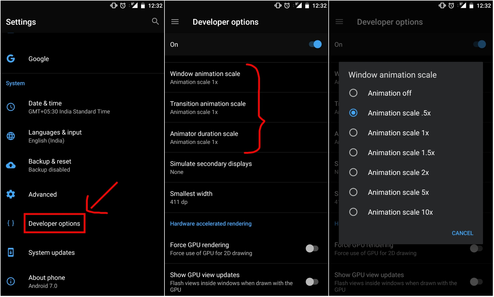 Theo mặc định, bạn sẽ thấy thông số “1x” ở bên cạnh những cài đặt đã đề cập phía trên. Tiếp đến, bạn chỉ cần chạm vào một trong 3 phần cài đặt này và thay đổi từ “1x” sang thành “.5x“, sau đó thoát ra khỏi phần Developer.