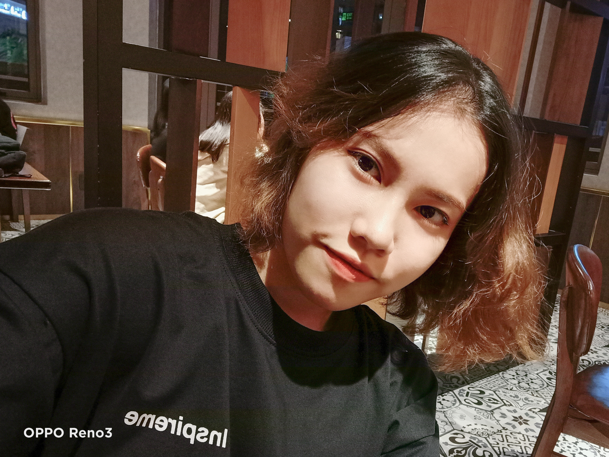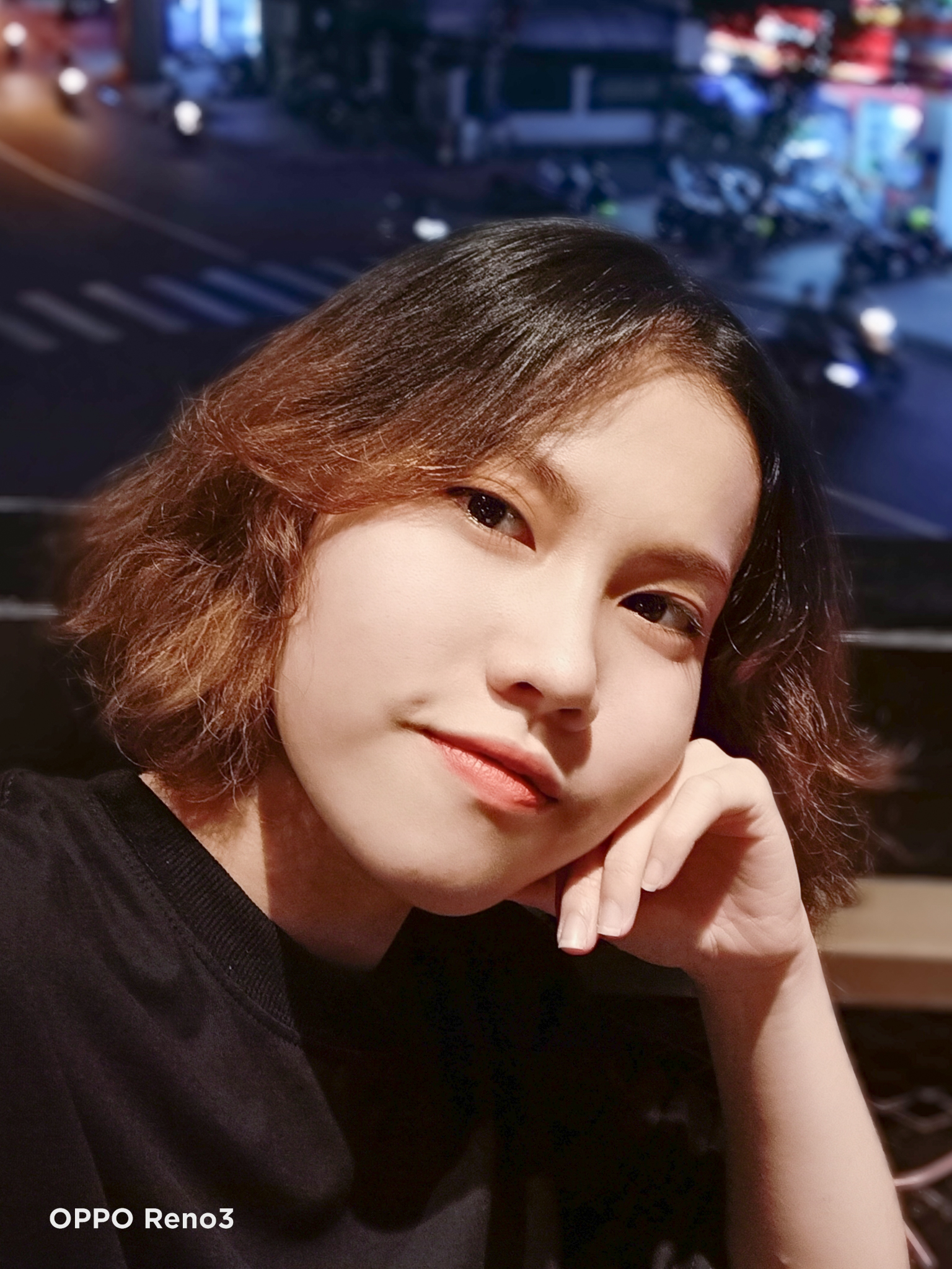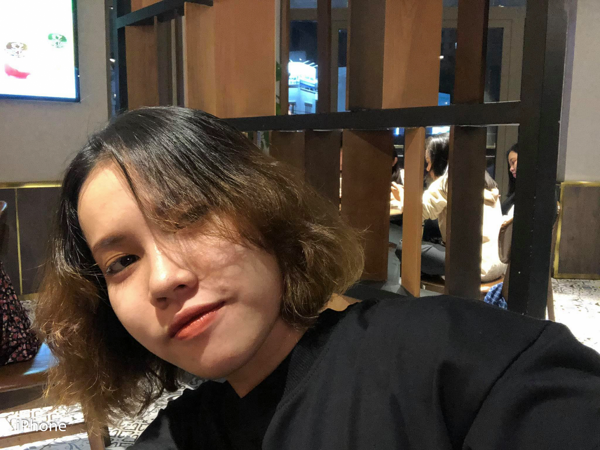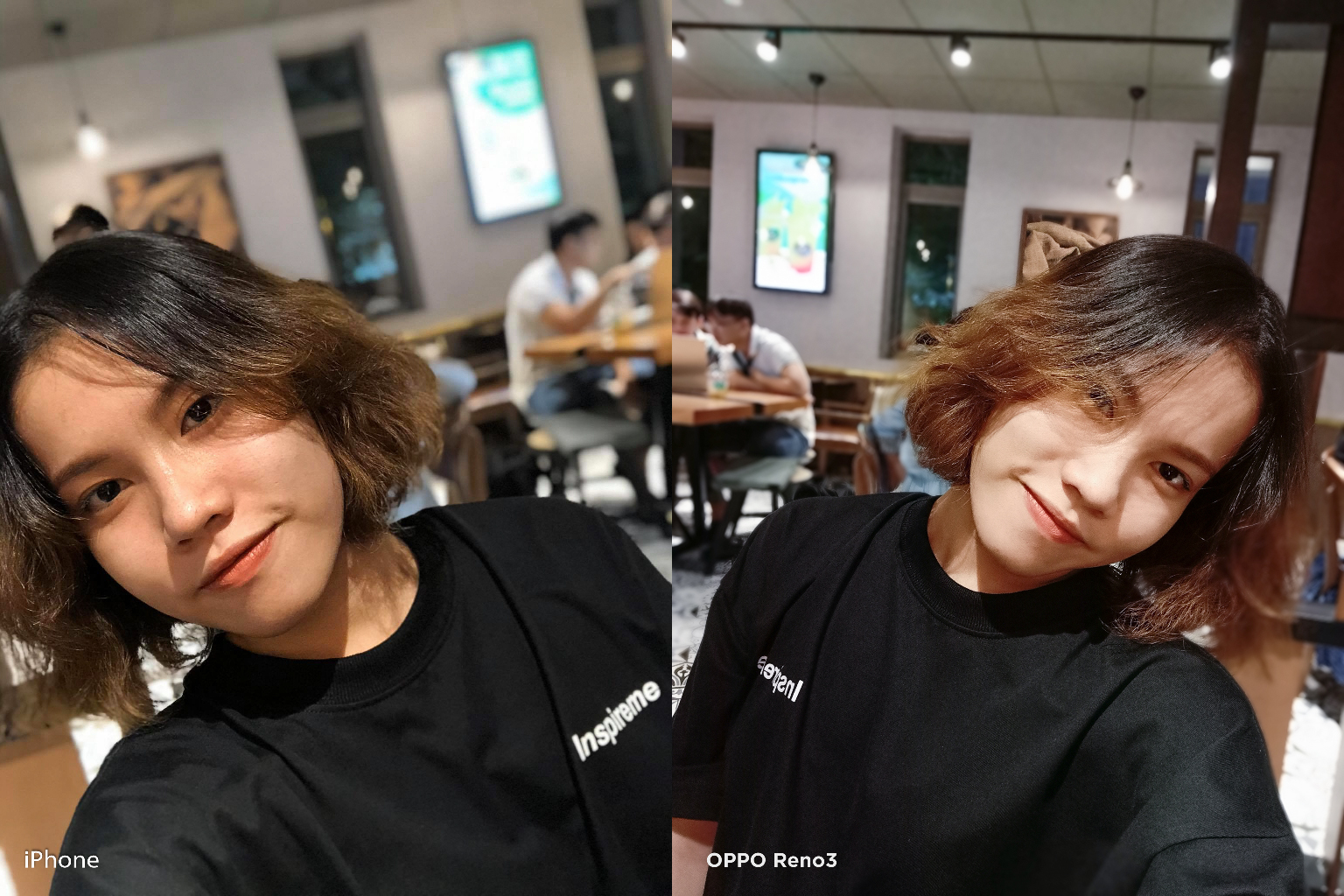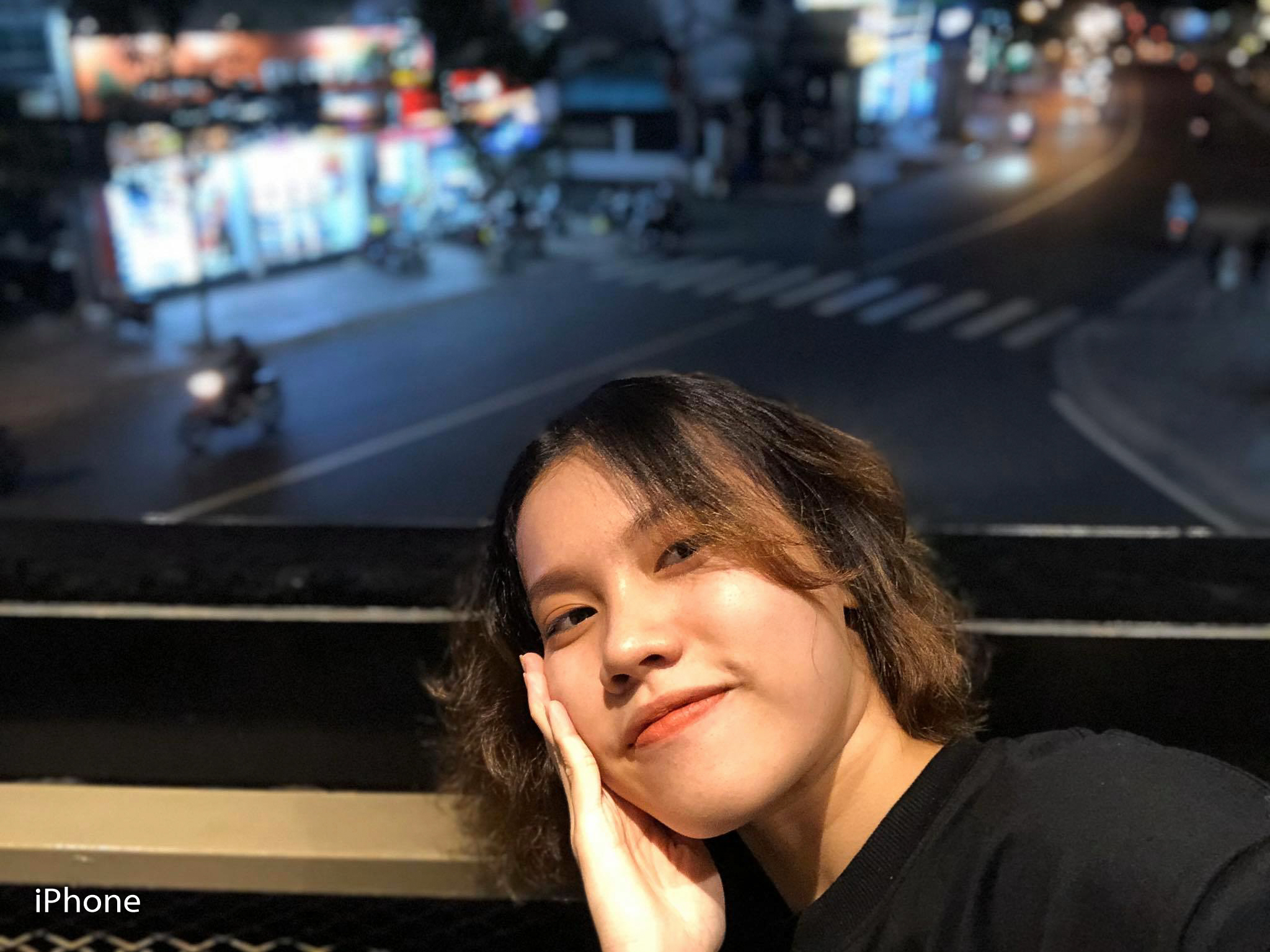 Cả iPhone X và OPPO Reno3 đều có chế độ Chân Dung khi selfie, đem lại những bức hình xóa phông lung linh. Việc nhận diện chủ thể và xóa phông trên cả hai tương đối tốt, các chi tiết khó như vùng tóc tuy vẫn còn bị lem nhẹ nhưng nhìn chung bức ảnh trông “nghệ” hơn hẳn so với chụp bình thường. Chất ảnh giống với tình huống đầu tiên khi iPhone hướng tới tính chân thực. Trong khi đó smartphone của OPPO với công nghệ AI Beauty làm đẹp chủ thể nhưng vẫn giữ được độ tự nhiên cần thiết.