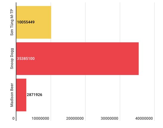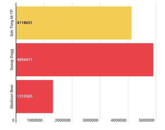 Trên sân chơi YouTube, Sơn Tùng M-TP tỏ ra không kém cạnh so với đàn anh Snoop Dogg mặc dù mình là một nghệ sỹ trẻ khi có 4,11 triệu người theo dõi. Snoop Dogg cùng kênh YouTube “westfesttv” trong khi đó có 4,89 triệu lượt theo dõi. Madison Beer là người có kênh YouTube với số lượng người theo dõi khiêm tốn nhất trong số ba cái tên này cùng con số 1,31 triệu người. Video mới nhất của cô được phát hành khoảng một tháng trước hiện có khoảng 7,7 triệu lượt xem.
