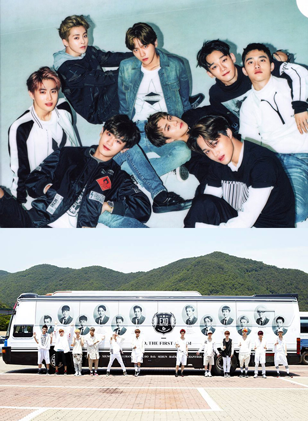 Nhóm EXO sử dụng hẳn một chiếc xe buýt cho mục đích di chuyển cả nhóm. Hiện chưa rõ thương hiệu của chiếc xe buýt này, tuy nhiên nó được cho là có giá trị lên tới 163,5 nghìn USD. Điểm đặc biệt về chiếc xe buýt này ở chỗ nó luôn được dán decal kín xe với hình ảnh chủ đạo là các chàng trai nhóm EXO. Việc dán decal như thế này vừa đáp ứng được mục đích quảng bá trong khi đó lại đảm bảo tính riêng tư.