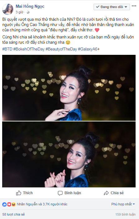 “Bí quyết vượt qua mọi thử thách của Nhi? Đó là cười tươi rồi thả tim cho người yêu Ông Cao Thắng như vậy, để nhắc nhở bản thân rằng thanh xuân của chúng mình cũng quá “điệu nghệ”, đầy chất thơ. Cùng Nhi chia sẻ khoảnh khắc thanh xuân rực rỡ của bạn mỗi ngày để luôn tỏa sáng rực rỡ đầy chói chang nha. #BTD #BokehOfTheDay #BeautyofTheDay #GalaxyA6+“.